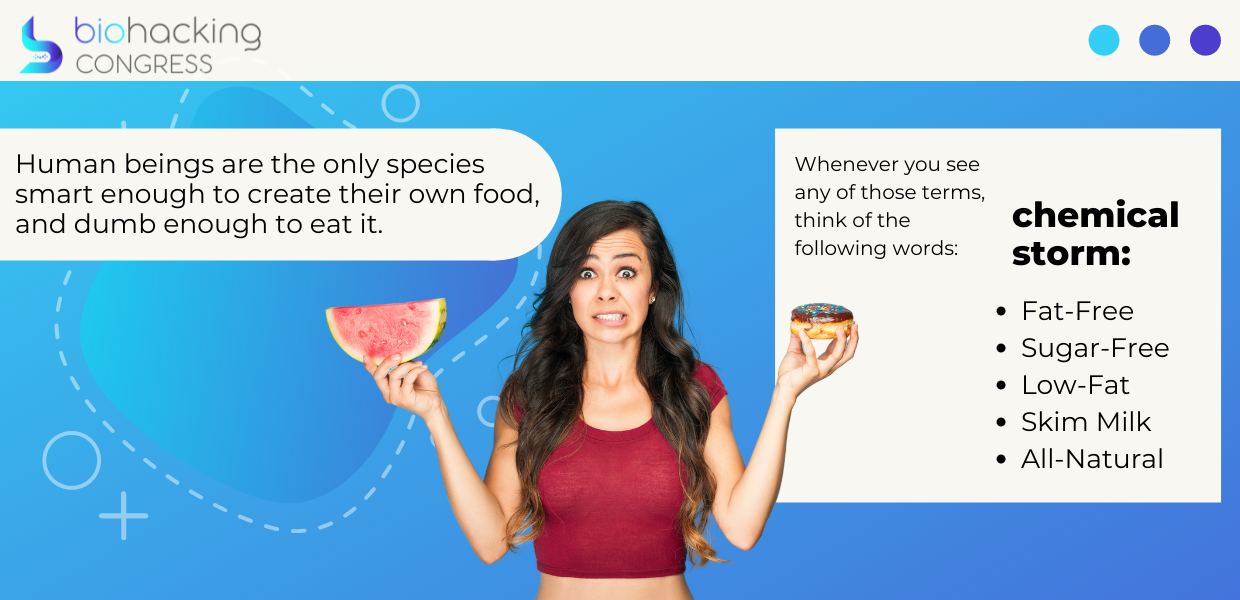 Another amazing stat or I should say sad stat: According to a 2004 report by Morgan, Ward, and Barton: "The contribution of cytotoxic chemotherapy to 5-year survival in adult malignancies. ... survival in adults was estimated to be 2.3% in Australia and 2.1% in the USA." That means if somebody had breast cancer and they did only chemotherapy no lifestyle changes five years later in the US the chances of them being alive are 2.1 %. What if I told you the same food given to cancer patients in the hospital going through chemotherapy is the same food that actually could contribute to cancer growth? Because here's the truth: human beings are only species smart enough to create their own food and dumb enough to eat it. When you see these on your labels you are going to think of the two words there: fat-free, sugar-free, all-natural - just think of the chemical storm!
