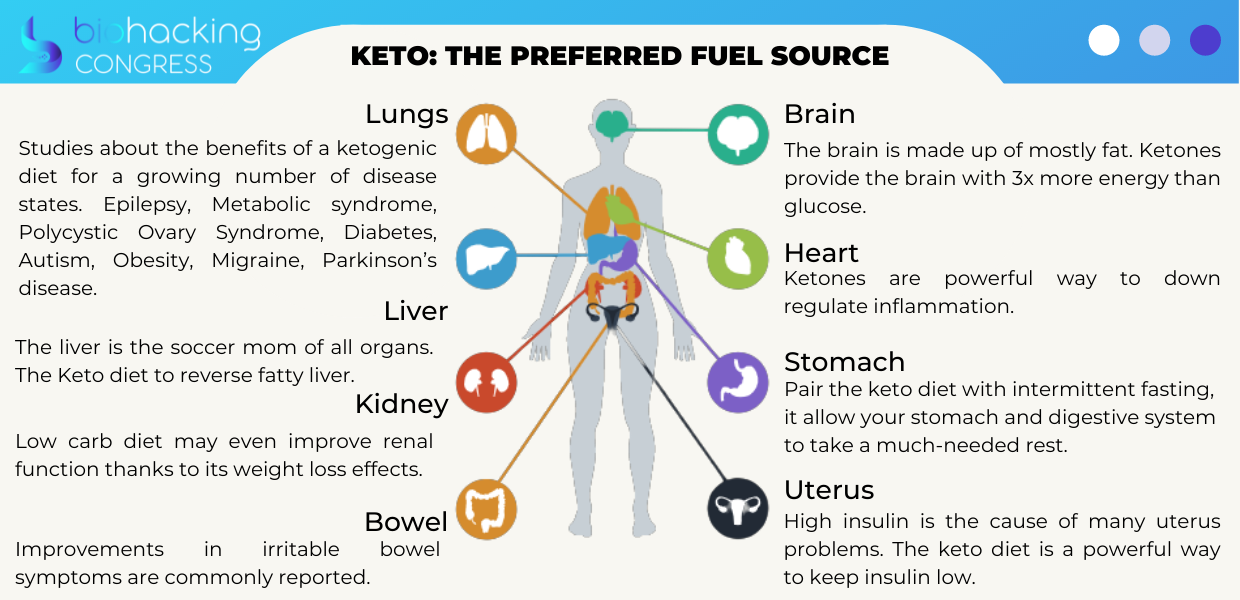 I'm gonna outline five biohacking tips to help you accomplish those three steps. I'm a keto guy. I think it's important to burn fat instead of sugar and flex in and out of ketosis, so the first hack is going to be to get fat adapted. Keto is not a diet. It's a metabolic process your body is designed to go through a period of ketosis. Every single one of our ancestors did keto. It's not a fad, it's a fact. Every single one of our ancestors did keto, their environment forced them into ketosis. But they also when they had the opportunity got out of ketosis which is metabolic flexibility. We know that ketosis burning fat is the primary fuel source for the body, and we are designed to burn fat. That is our birthright to burn fat. Numerous studies show it benefits all parts of your body.
