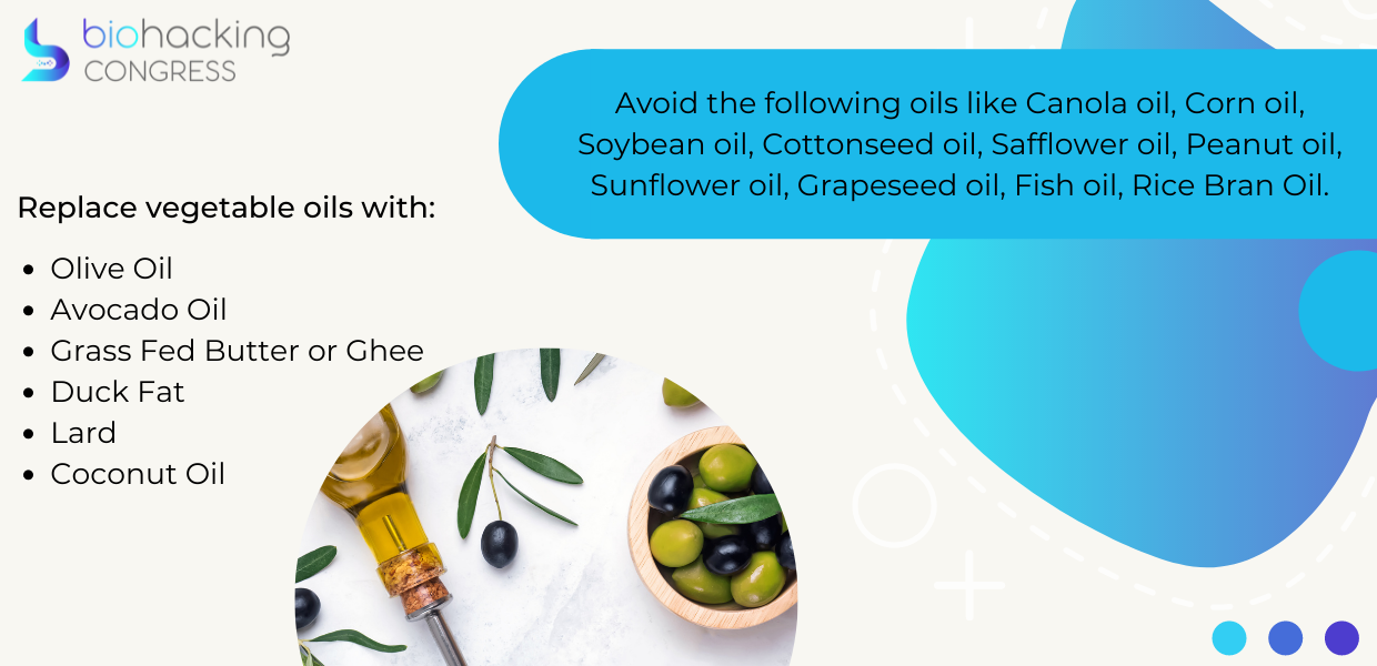 Replace vegetable oils with Olive Oil, Avocado Oil, Grass-Fed Butter or Ghee, Duck Fat, Lard, Coconut Oil.