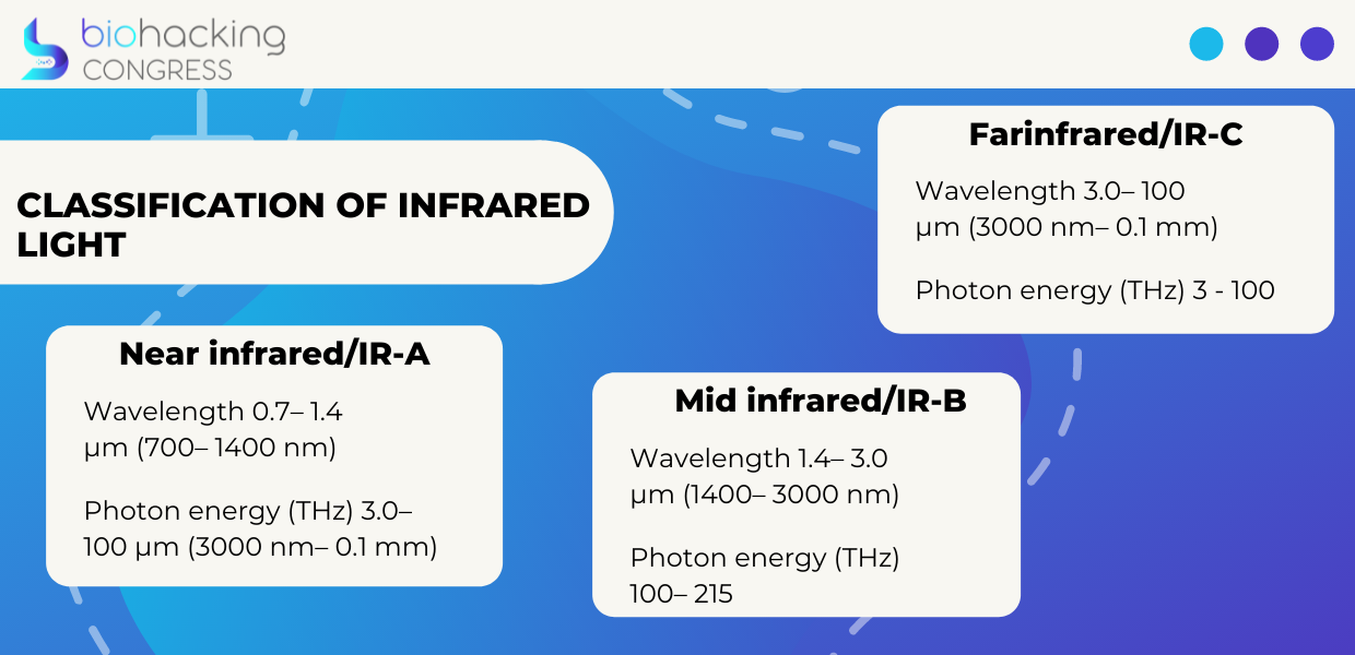 The classification of infrared light has three subdivisions for infrared radiation: near-infrared, mid-infrared, and far-infrared, it's known as ira or infrared A, infrared B, and infrared C respectively the wavelength.