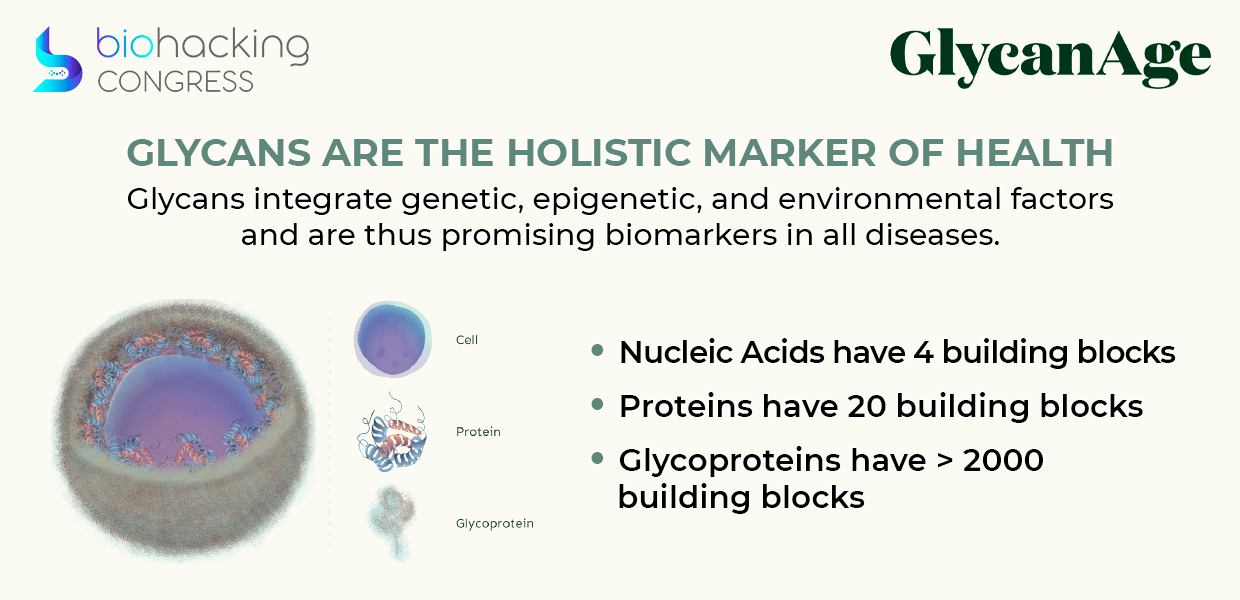 The ultimate layer of molecular complexity is glycans in comparison to DNA, we have four building blocks, in proteins, we have twenty building blocks, and glycoproteins have two thousand building blocks. They significantly increase the complexity of our organism and give us a holistic view of what's going on. Glycans are the holistic marker of health. Our Glycan-based biomarkers integrate genetic, epigenetic, and environmental factors enabling precision medicine.