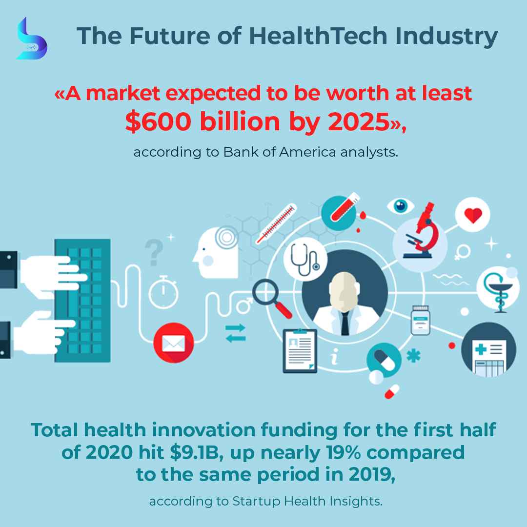 According to Bank of America analysts, this market is expected to be worth at least $600 billion by 2025. Total health innovation funding for the first half of 2020 hit $9.1B, up nearly 19% compared to the same period in 2019, source: StartUp Health Insights.