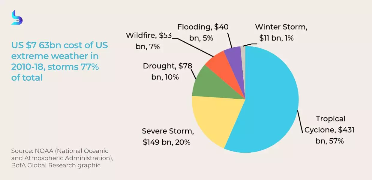 The incidence of extreme weather is rising worldwide in its many forms such as tropical storms, droughts, heatwaves, floods, wildfires and extreme cold, among others. 40% of US cities were affected by some form of extreme weather in 2018 compared with only 15-20% over the 20th century (5-year rolling average) (source: NOAA).