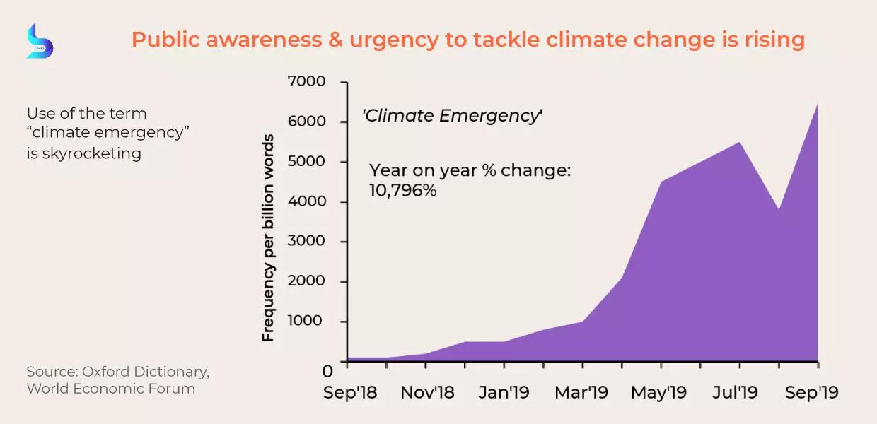 To put the public shift into perspective, by the widest margin since 2000, more Americans now believe environmental protection should take precedence over economic growth when the two goals conflict more. 65% now choose the environment, while 30% choose the economy (source: Gallup). Furthermore, use of the term “climate emergency” was 100x more common in 2019 than the previous year (source: Oxford Dictionary, WEF), as people around the world increasingly directly feel the effects of the climate crises, e.g., Australian bushfires, Amazon and California wildfires etc.