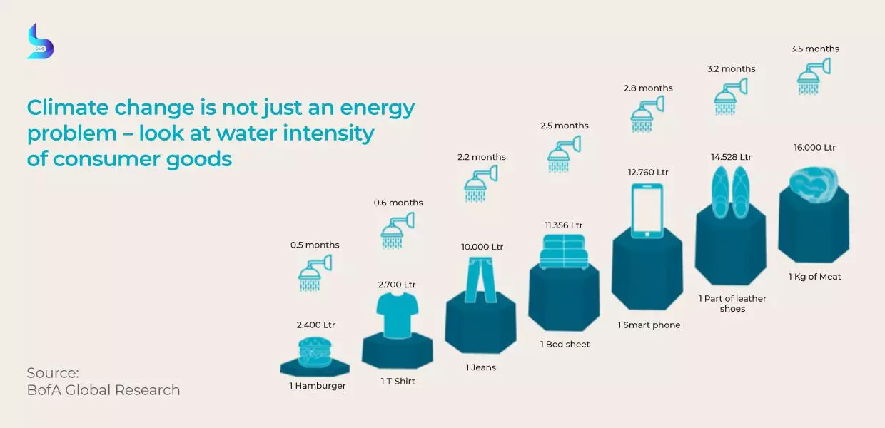 - Eating 1kg of steak is equal to using 16k liters of water (3.5 months of showers).