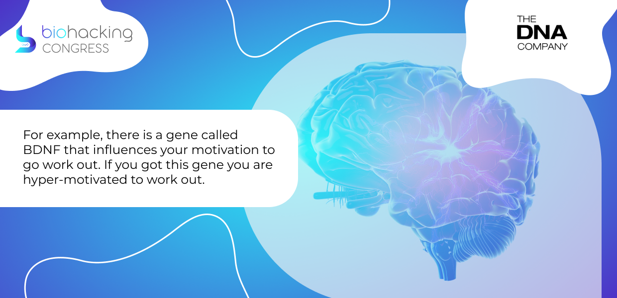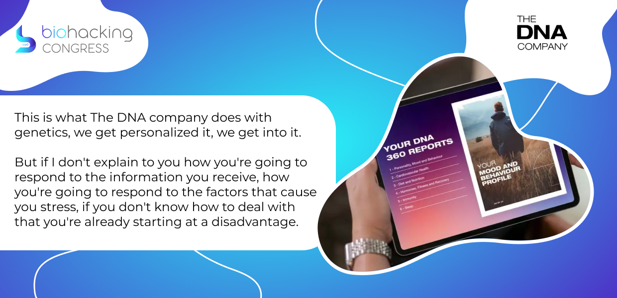 What we do at The DNA company, we help you understand not only like I could talk to you about the impact of the FOXO3 gene on the anti-oxidation capabilities and how that's a literal longevity gene. I could talk to you about the fact that there are at least 28 % of individuals in this room, right now, if they were to continue with cardiovascular exercise they would cause a heart attack to themselves. I could tell you about one in four individuals in this room right now, that if they were to get on a ketogenic diet they would have diabetes within a year without eating any sugar. I could do that for you and that's what we do with the genetics we get personalized, we get into it. But if I don't explain to you how you're going to respond to the information you receive, how you're going to respond to the factors that cause you to stress, if you don't know how to deal with that you're already starting at a disadvantage. When it comes to your longevity, where are the top four things that people tell you to improve your life? "I want you to eat better", "I want you to sleep more", "I want you to have less stress", and "I want you to do more exercise". Everyone will tell you the same four things, I didn't need to go to a doctor for you to tell me that. I could have checked google for that. I could have found a thousand people telling me a thousand ways to fix all those things, but if I said "listen, here's your Dietary Profile. Here's how you respond to fats, here's how you respond to carbs, here's how you do this, but I'm also going to tell you that when you are upset about something the only thing that's going to make you happy is a tub of Haagen-Dazs ice cream. Genetically wired to feel happy when I eat ice cream. By the way, I could tell you that listen there's a gene out there called BDNF and if you were to pick up most genetic testing products reports they'll tell you that BDNF influences your motivation to go work out if you got this gene you are like hyper-motivated to work on the reality couldn't be further from the truth brain-derived neurotrophic factor improves and produces new neuronal connections in your body after the body's experienced some sort of trauma.