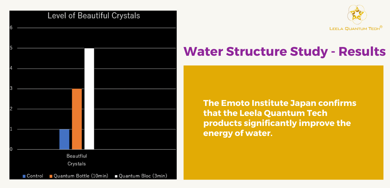 “The Emoto Institute Japan tested our products to study and visualize their effect on water. The results show a significant change in distilled water after being exposed to the Leela Quantum Bottle and Quantum Bloc.